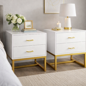 The Aurelia Nightstand blends clean modern design with refined detailing. Finished in a smooth high-gloss white, it features two spacious drawers with soft gold-tone handles for easy access and a polished look.