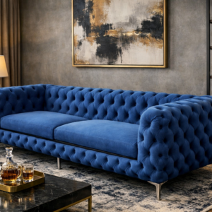 “Azure” reflects the deep blue tone of the sofa, while “Crest” represents a sense of premium quality and timeless design. The name highlights both the color and the elevated style of the piece without sounding overdone.