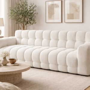 With its wide seating area, rounded armrests, and durable construction, the CloudGrid Bouclé Sofa combines style and functionality effortlessly. Whether placed in a minimalist setting or a cozy interior, it stands out as a statement piece while remaining practical for daily use.