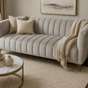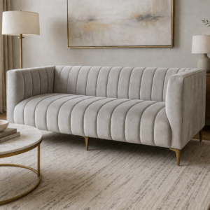 The Luma Curve Velvet Sofa brings a refined, modern look to any living space. Designed with a smooth channel-tufted finish across both the seat and backrest, it creates a clean, structured appearance while still feeling soft and inviting.