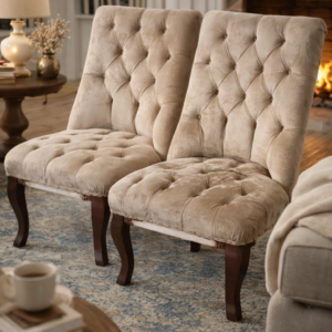 R2500 each The Willow Tufted Accent Chair combines comfort and elegance in one timeless design. Upholstered in a soft, neutral fabric, it features a classic button-tufted backrest and seat for a refined look. The gently curved silhouette provides comfortable support, while the sturdy wooden legs add durability and a touch of warmth.